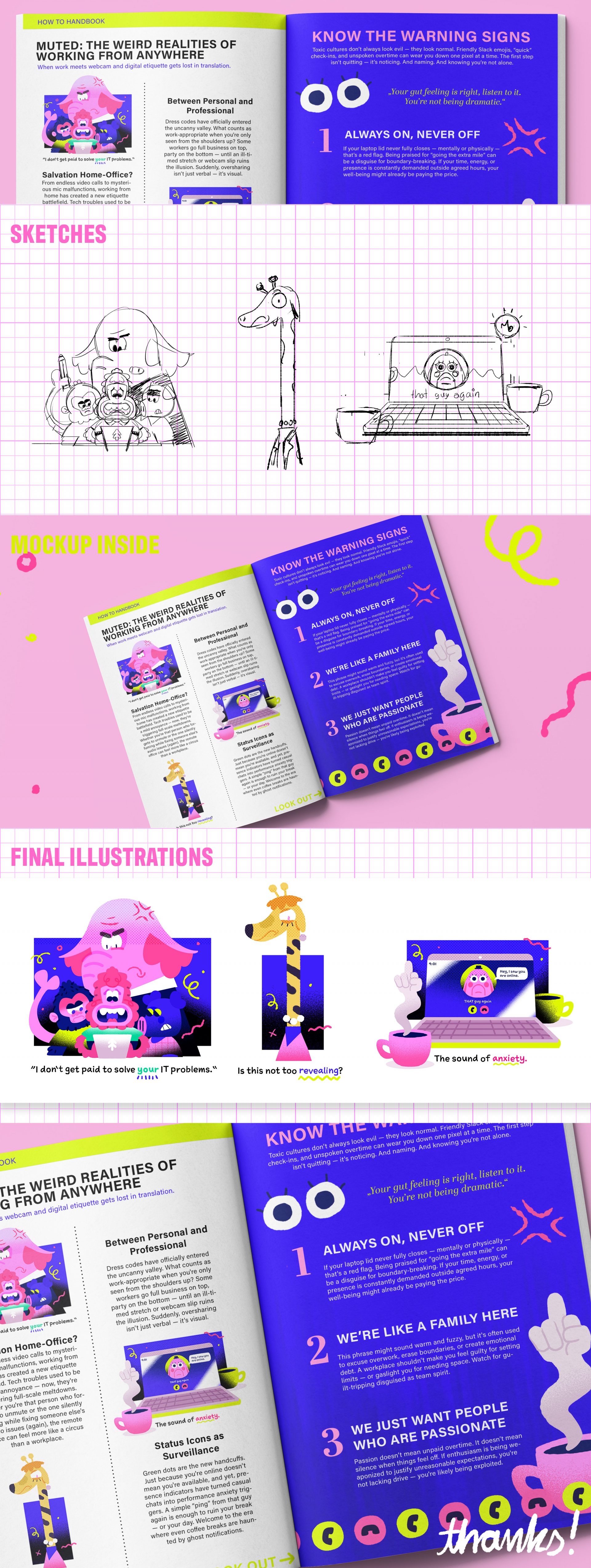 EN// The Magazine Spot Illustrations use bright colors, bold character design, and a playful visual language to explore the emotional weight of modern work environments from remote call fatigue to boundary-crossing office norms. Each animal character personifies a specific theme: anxiety, overexposure, frustration, or emotional exhaustion, creating a humorous but pointed reflection of everyday workplace struggles.